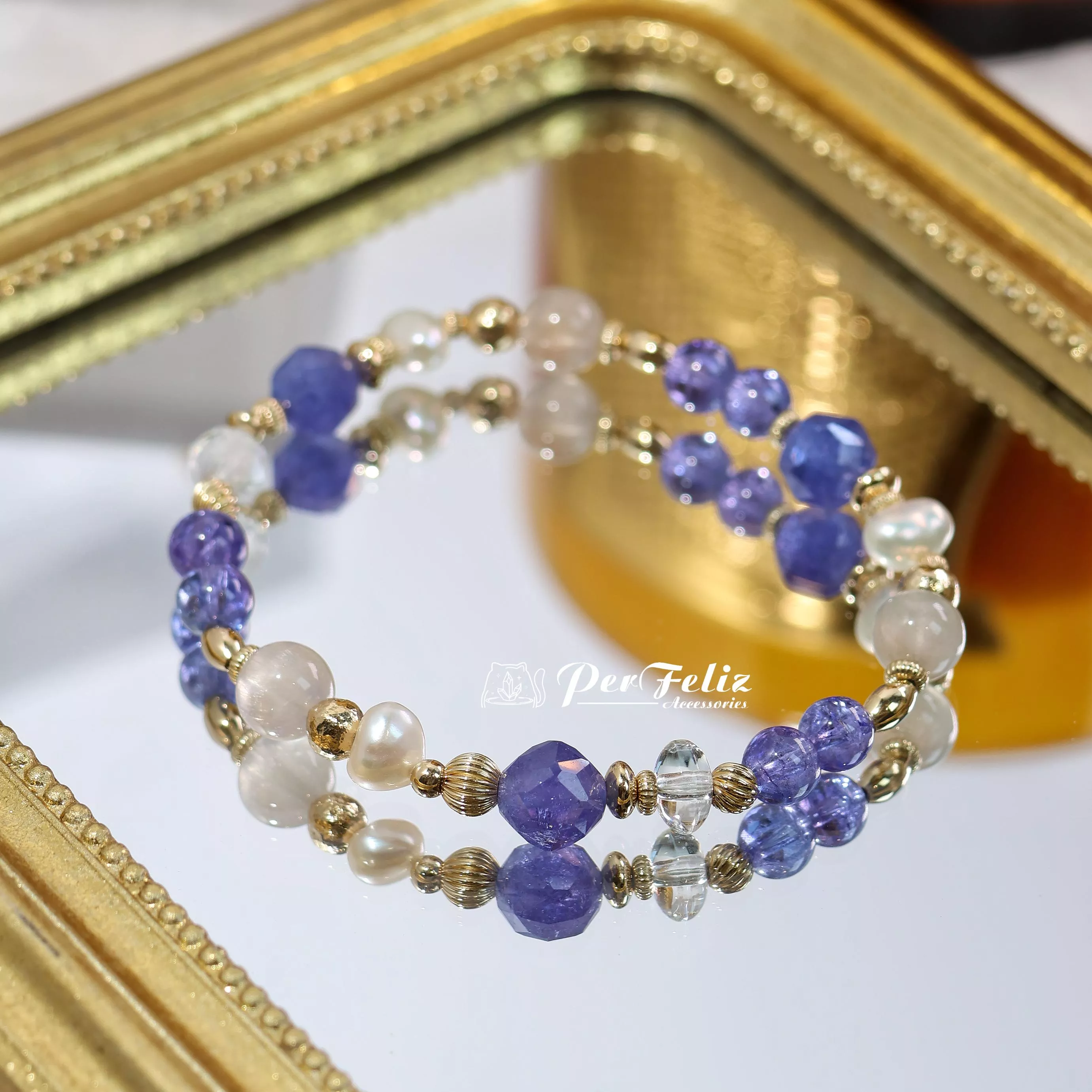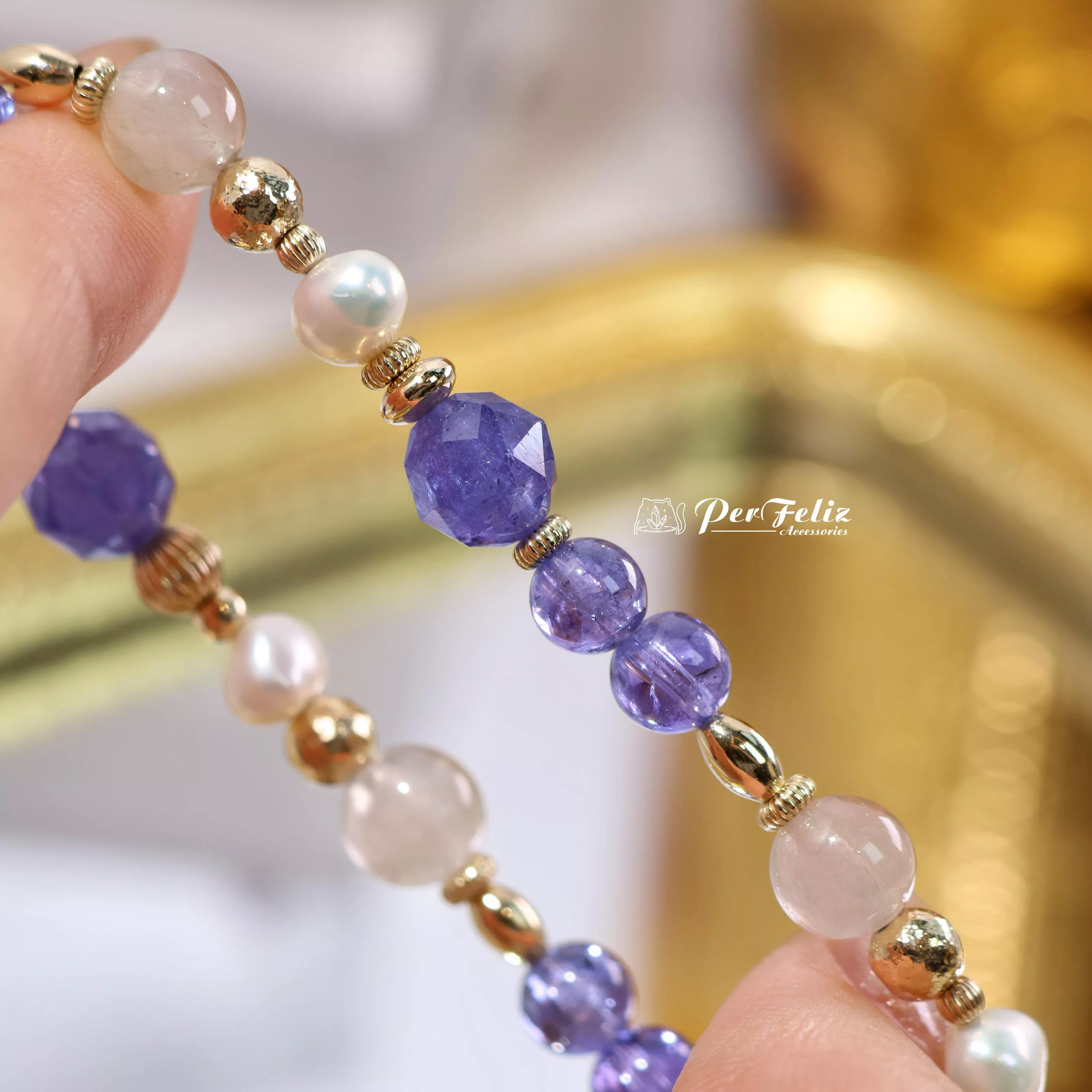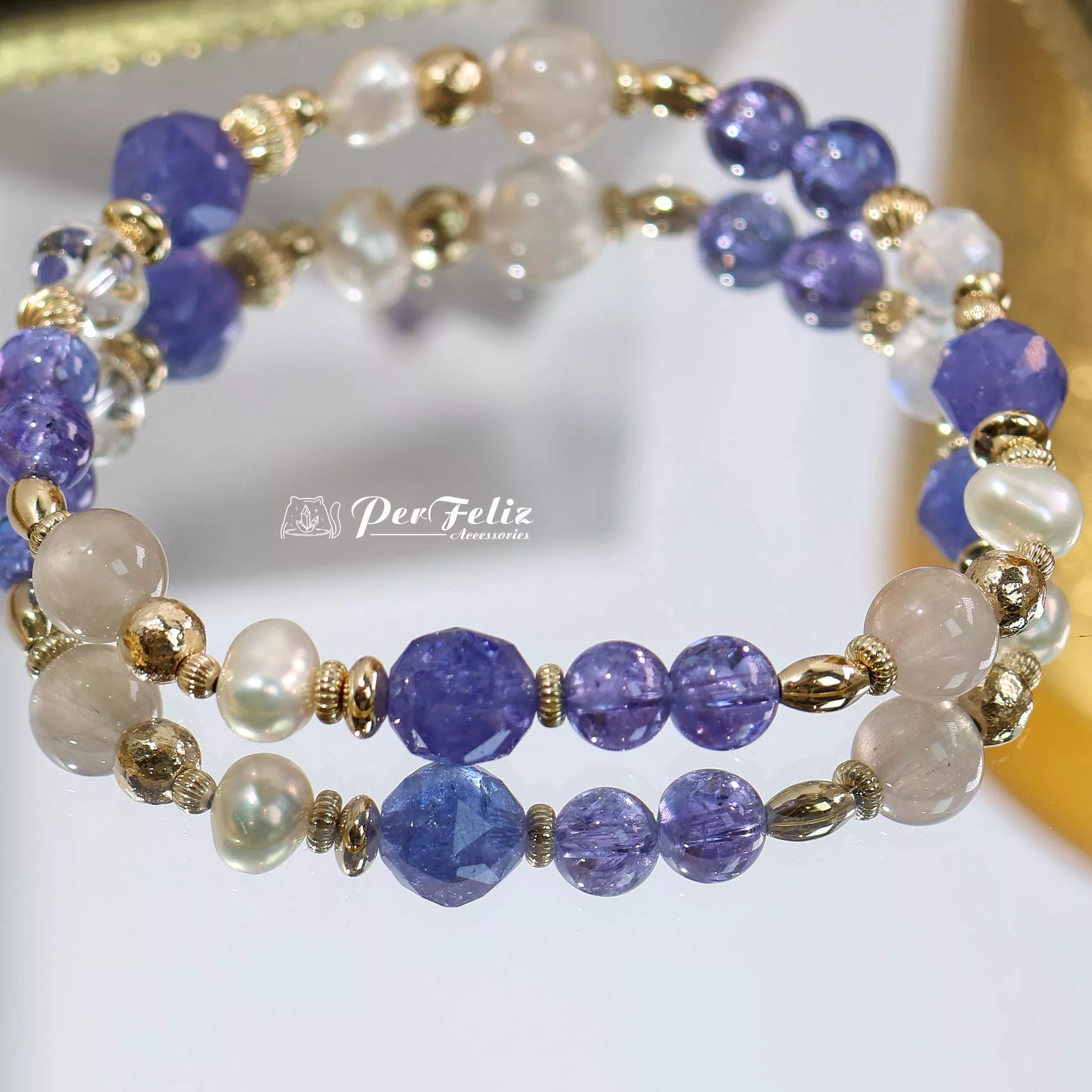 材料:坦桑鑽切/圓珠、白兔毛、珍珠、白水晶、藍月光鑽切