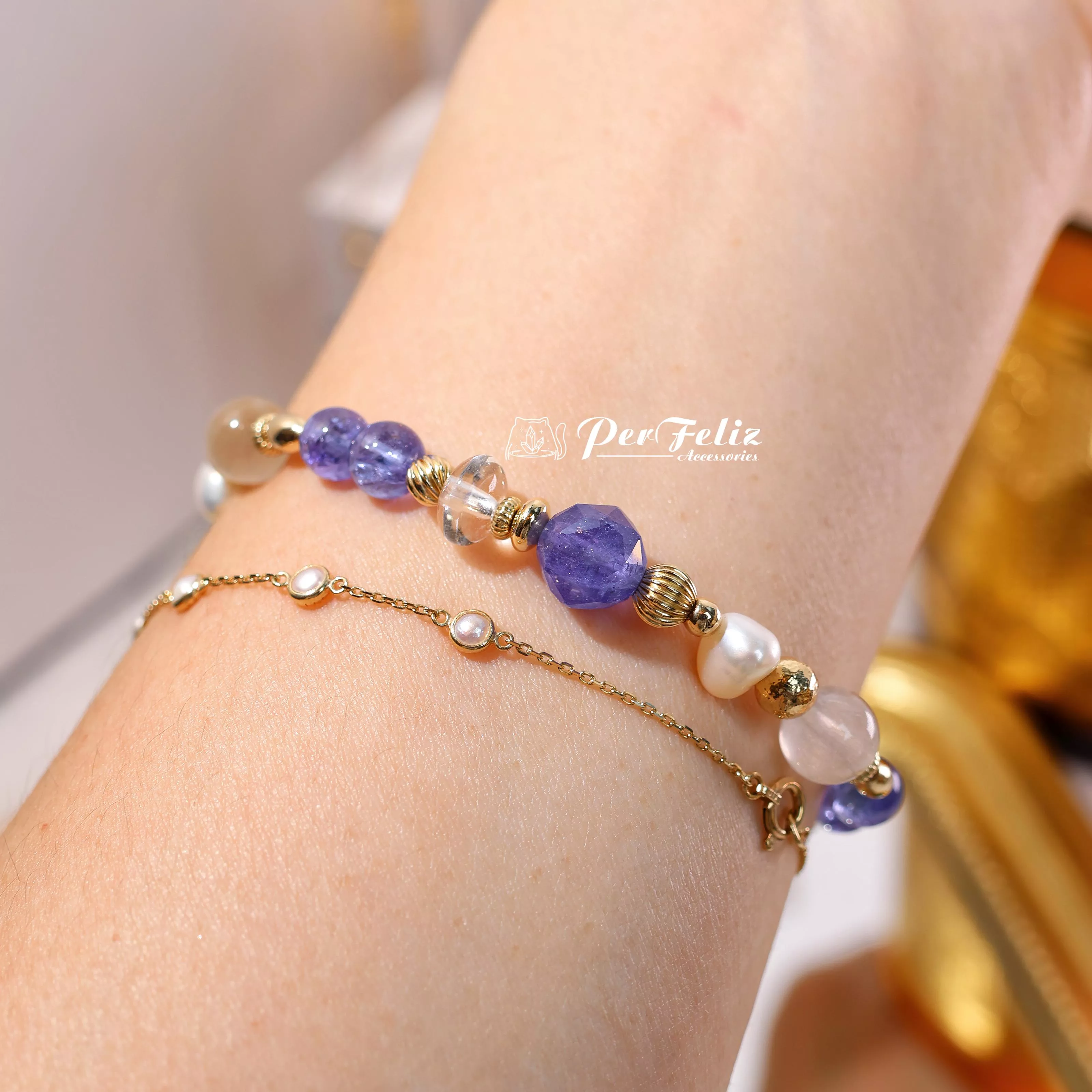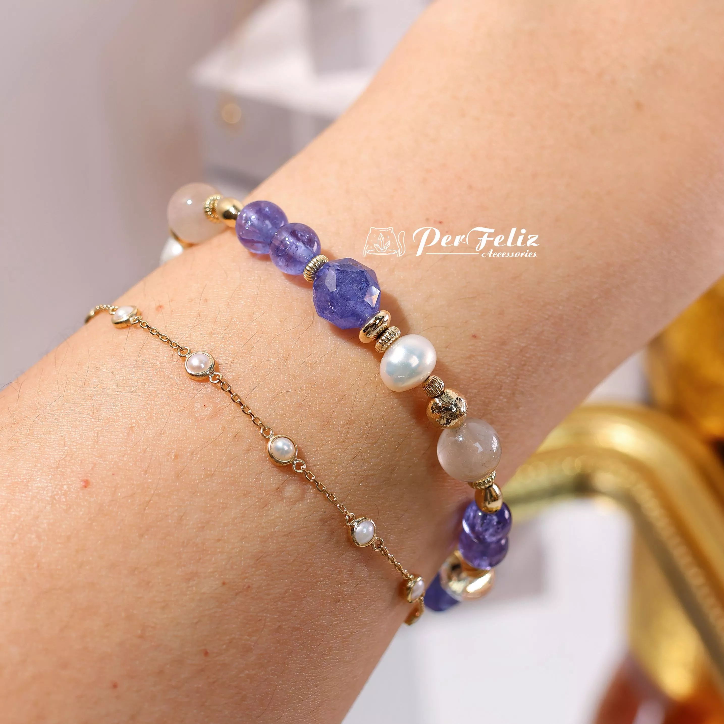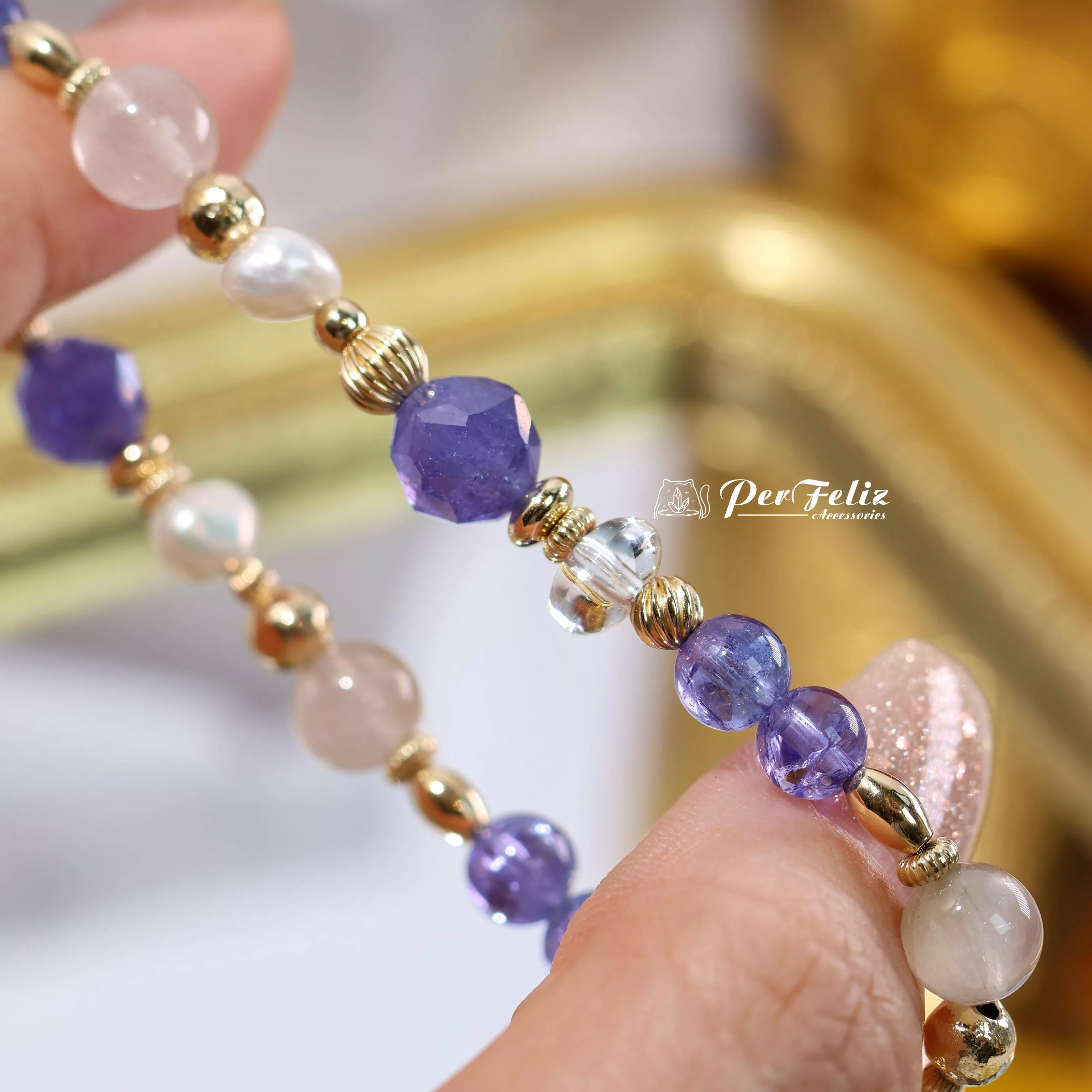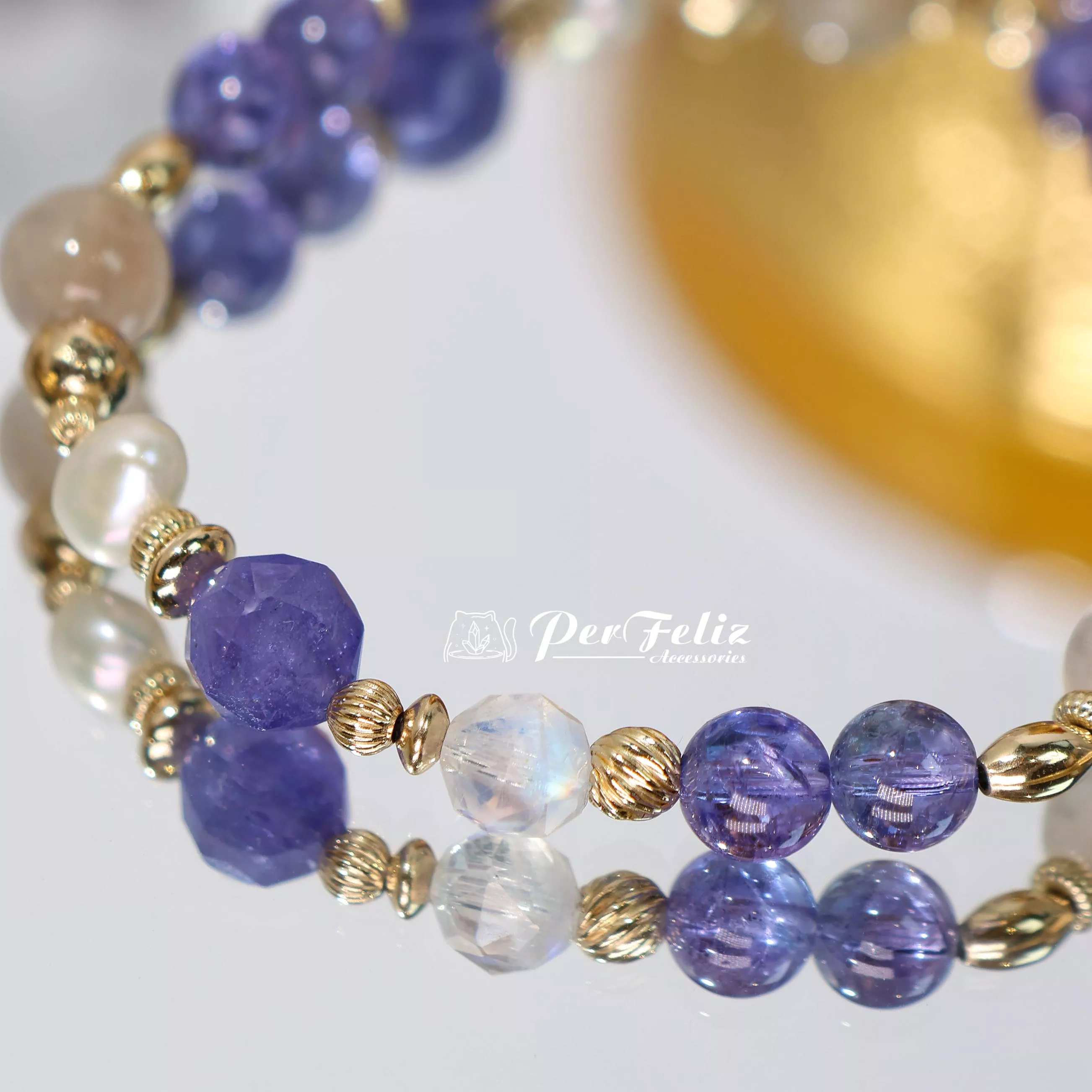 材料:坦桑鑽切/圓珠、白兔毛、珍珠、白水晶、藍月光鑽切