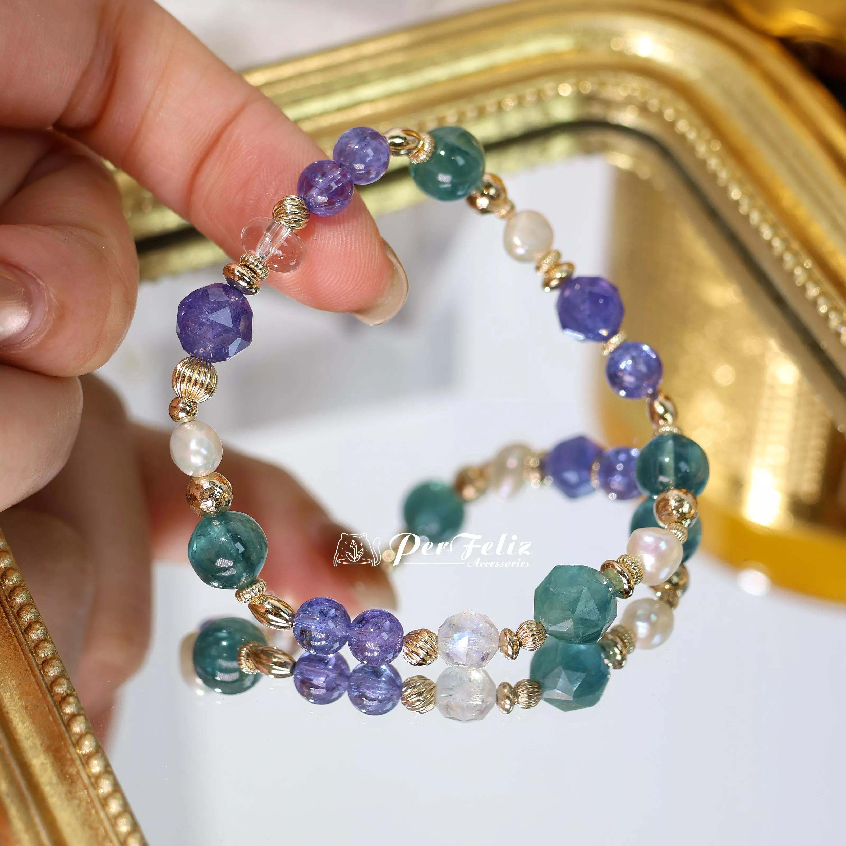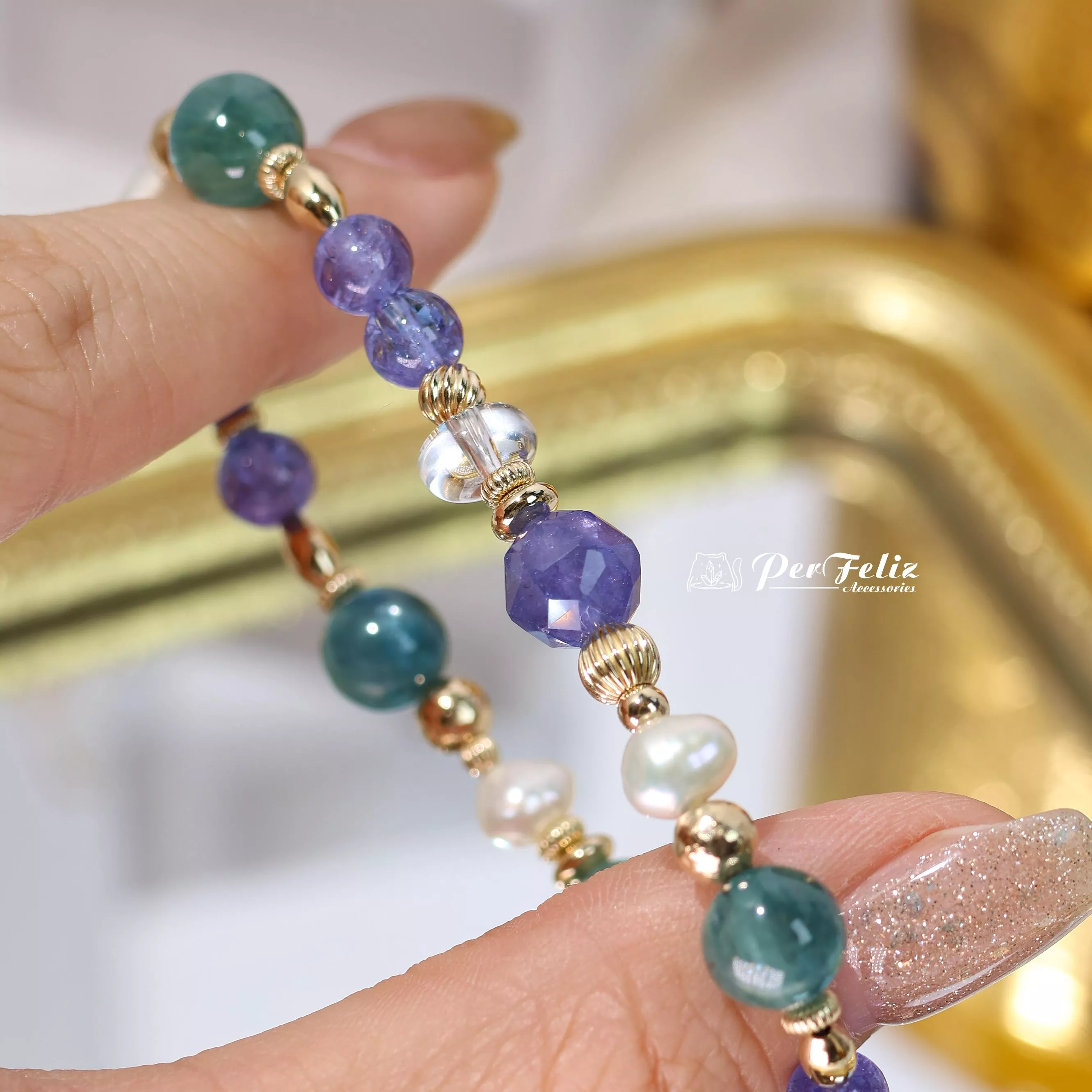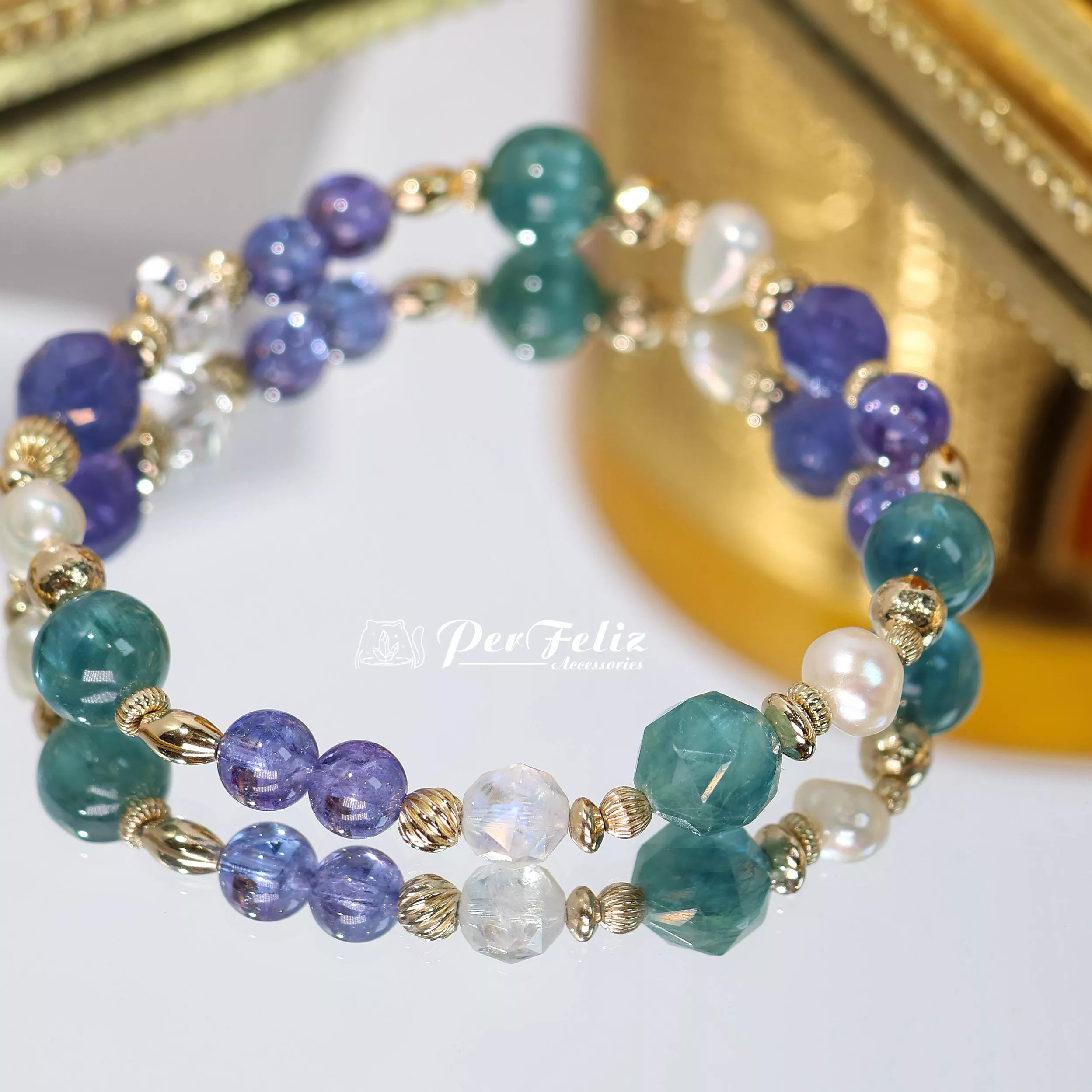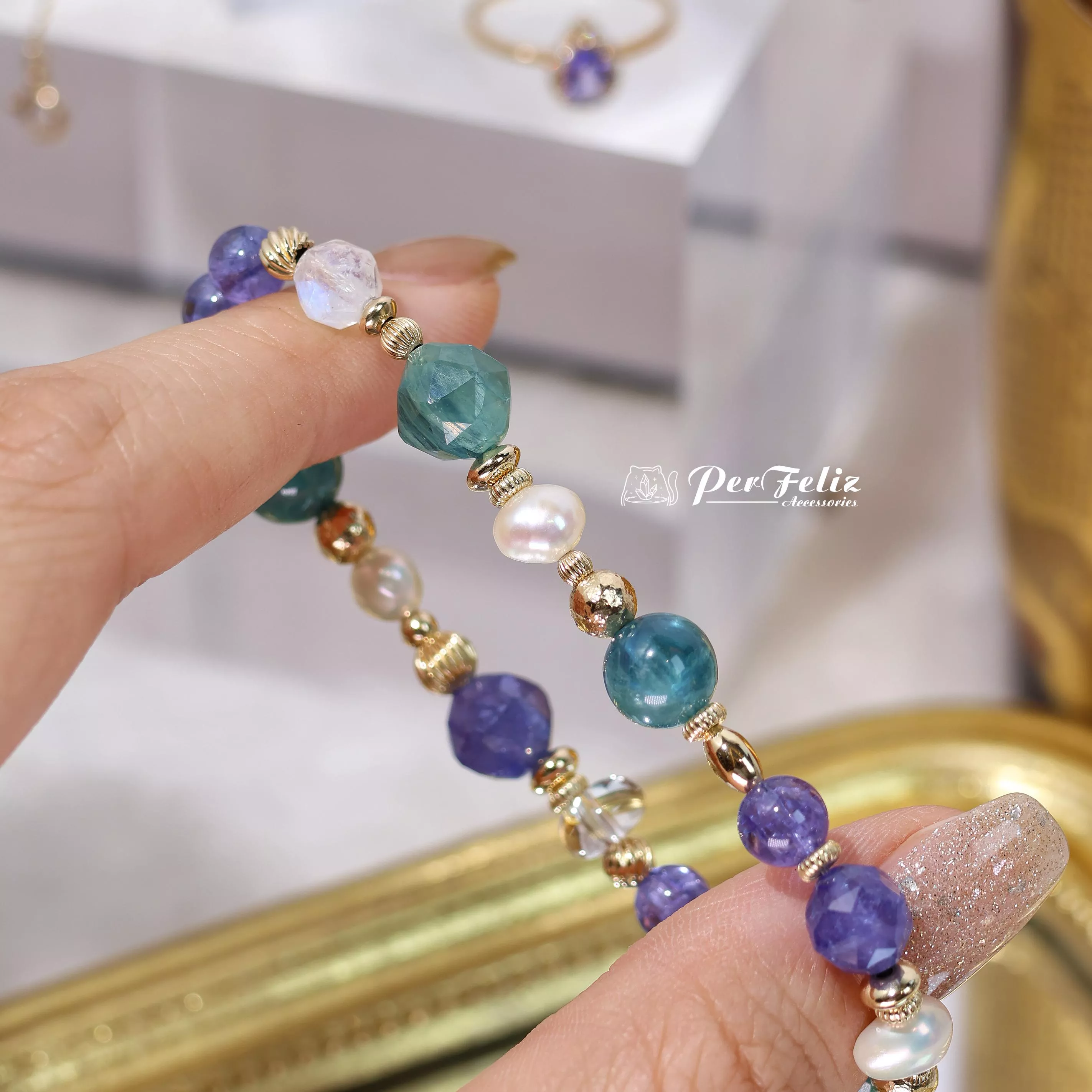 材料:坦桑鑽切/圓珠、藍綠晶鑽切/圓珠、珍珠、白水晶、藍月光鑽切