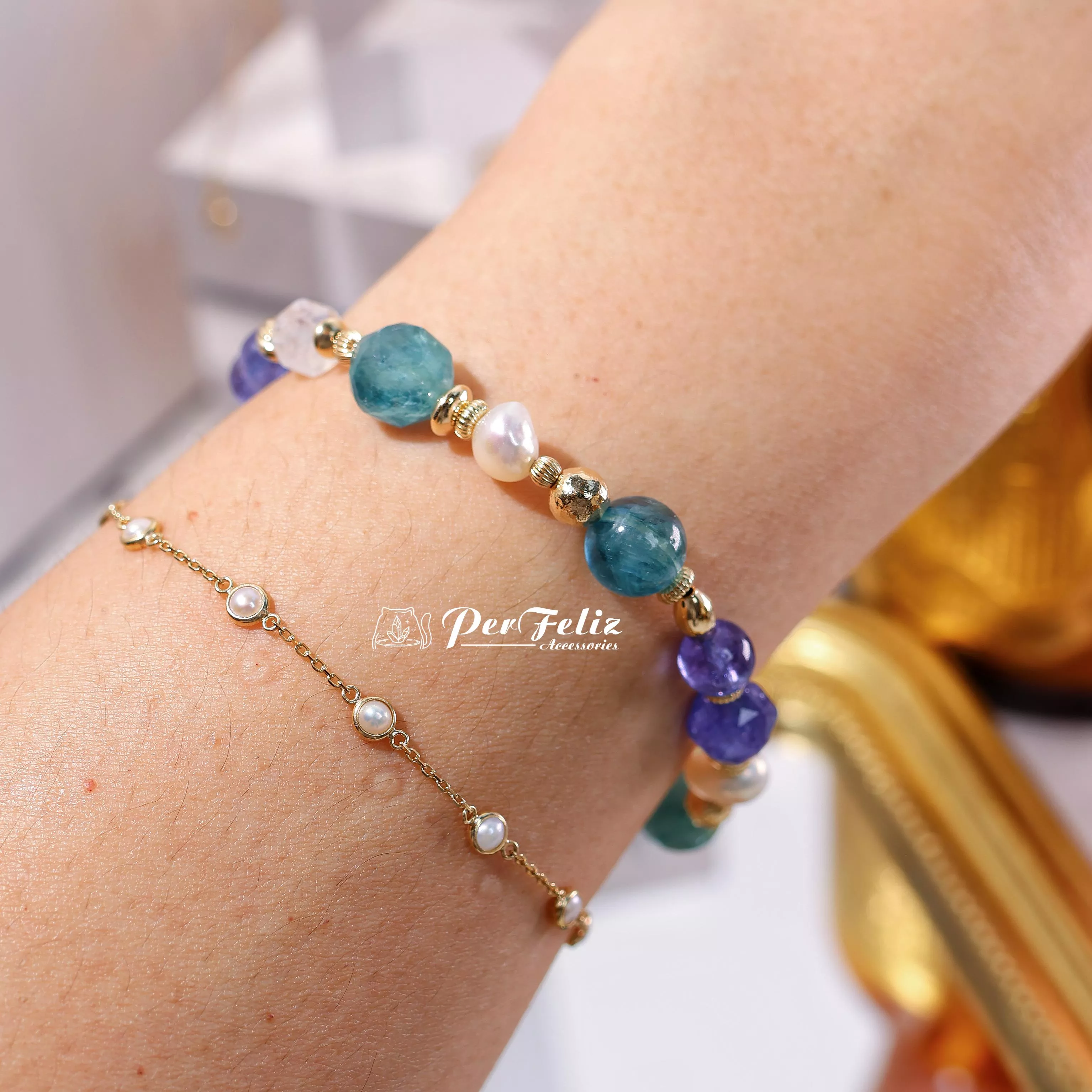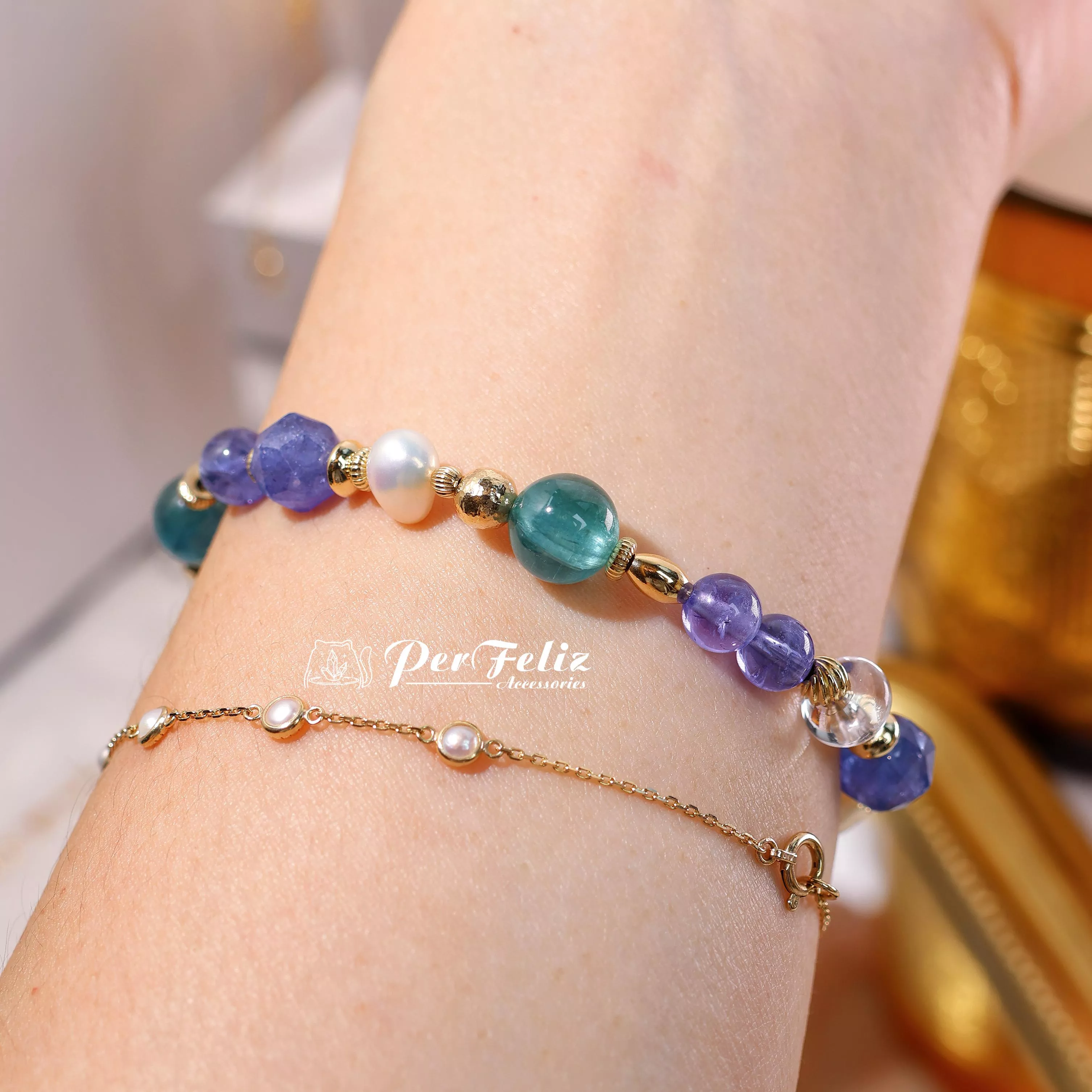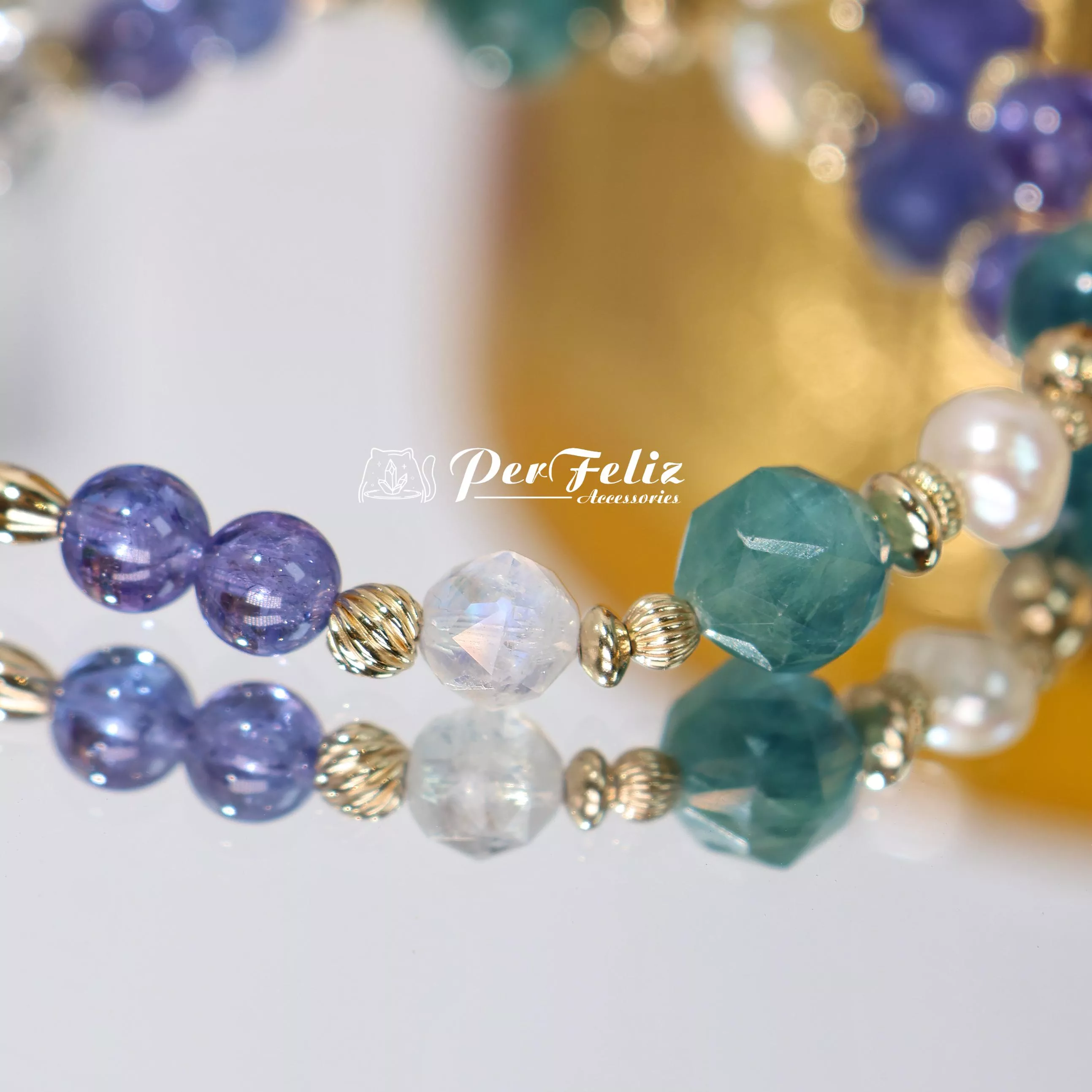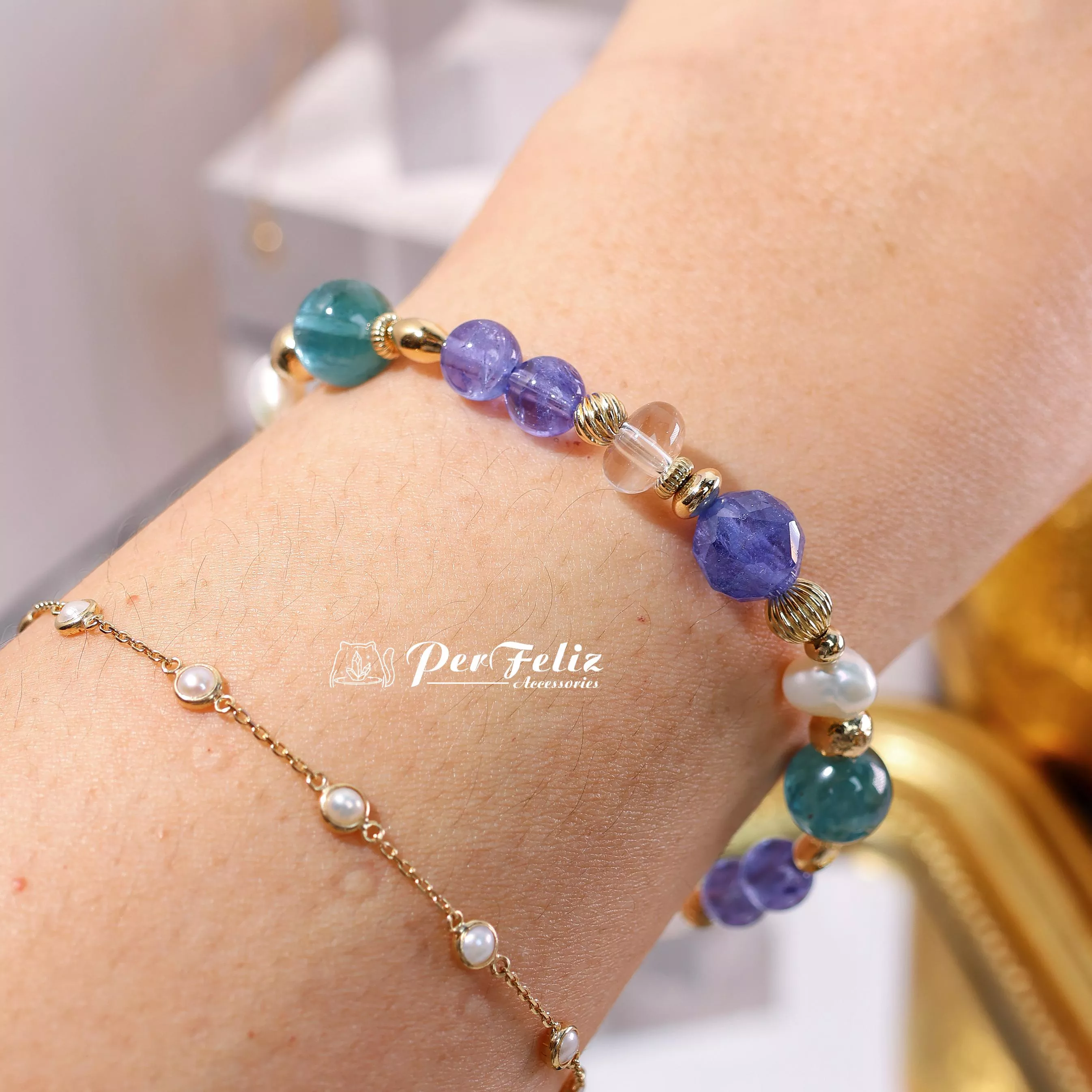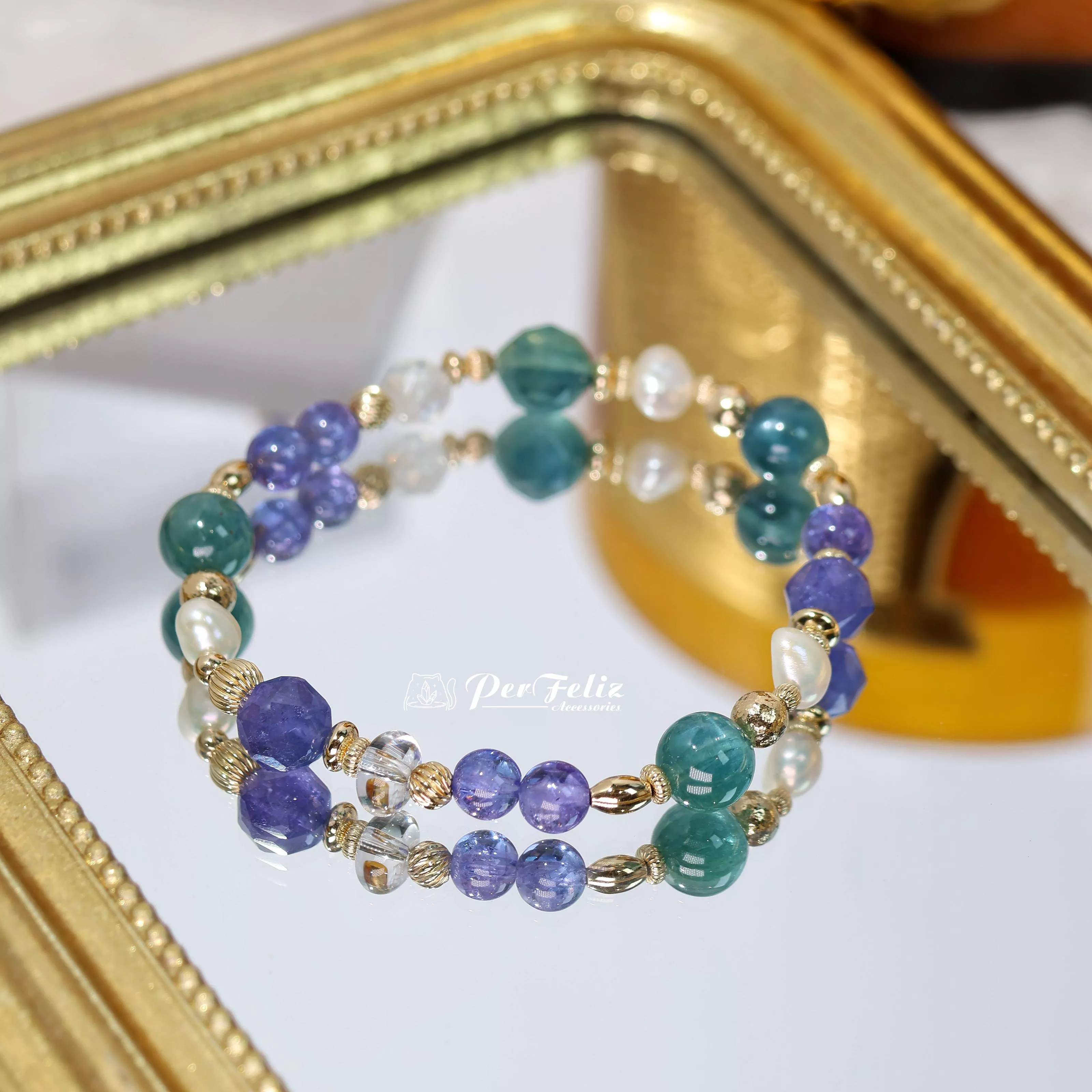 材料:坦桑鑽切/圓珠、藍綠晶鑽切/圓珠、珍珠、白水晶、藍月光鑽切