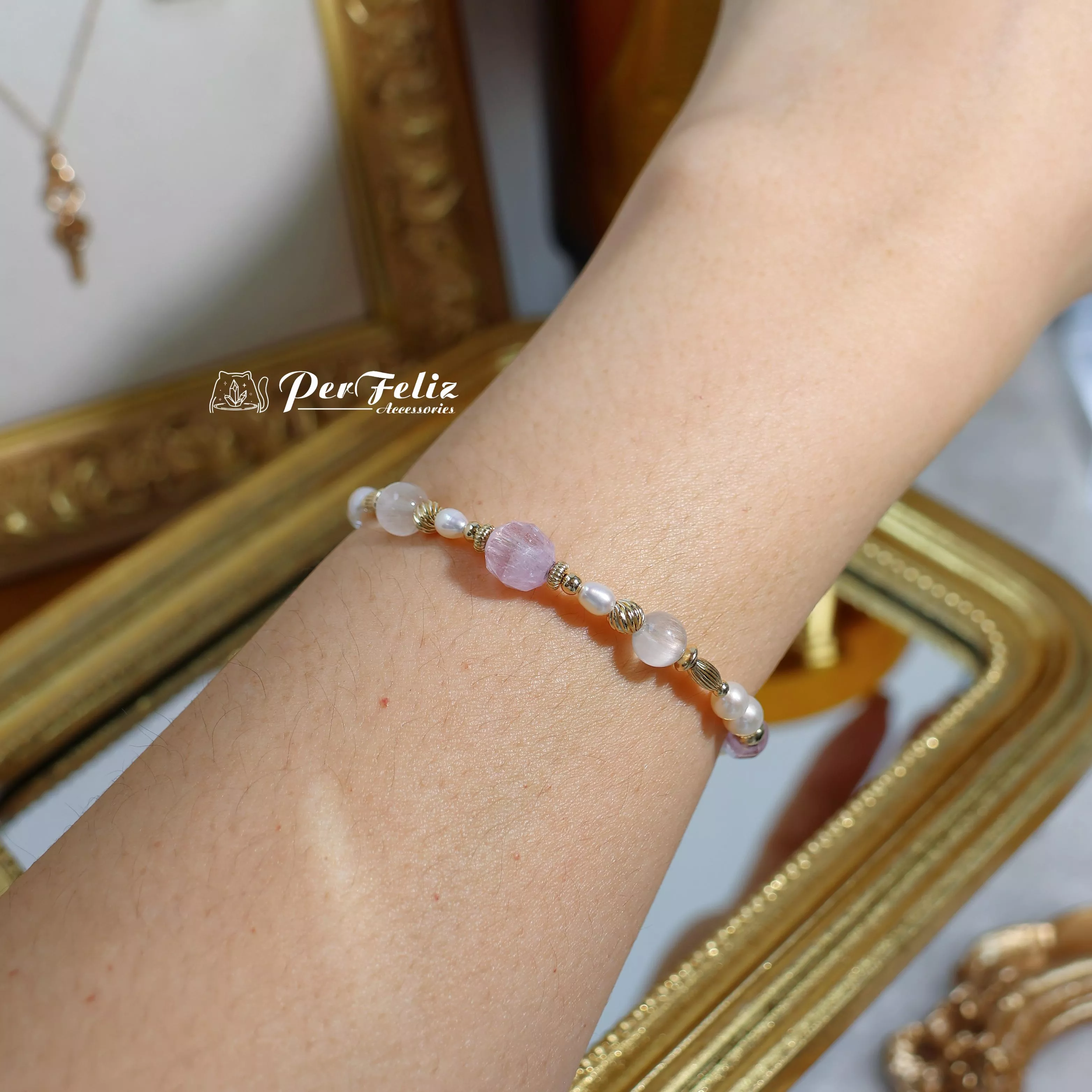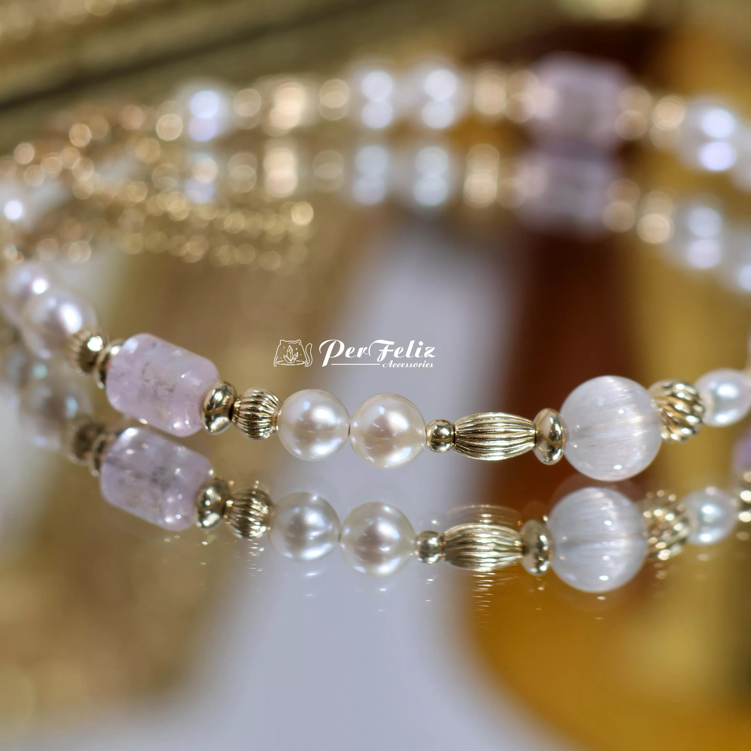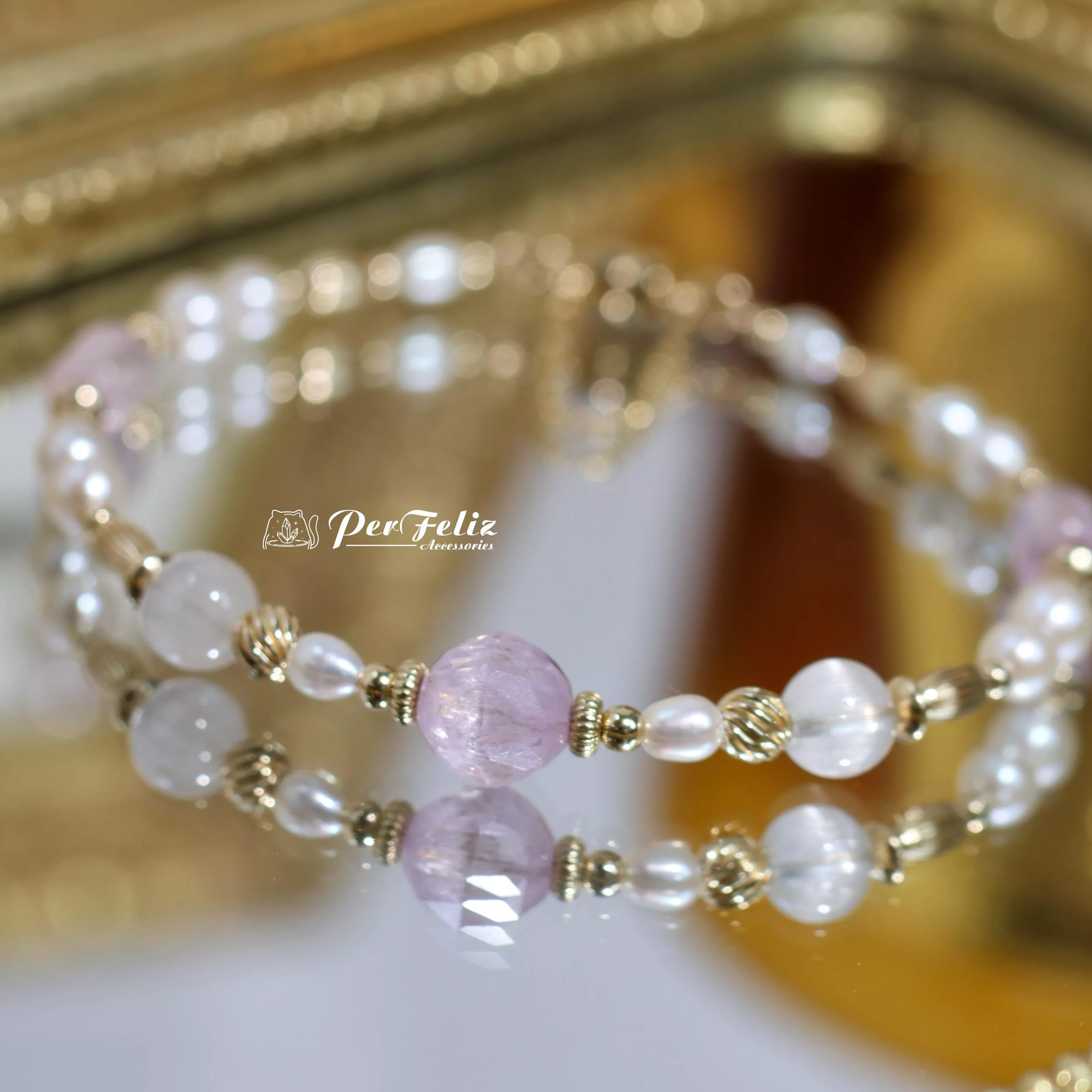 材料:紫鋰輝鑽切/桶珠、白兔毛、天然珍珠