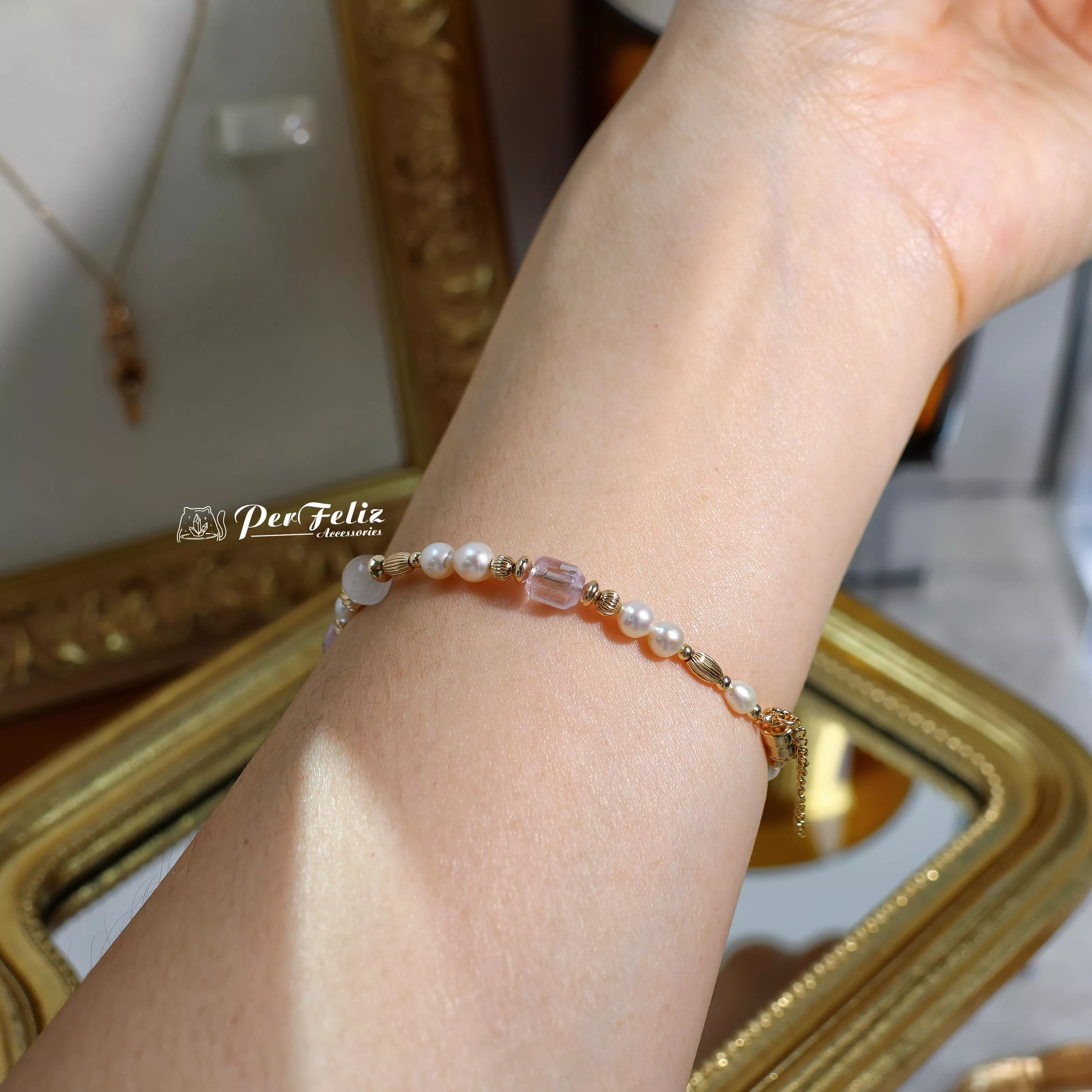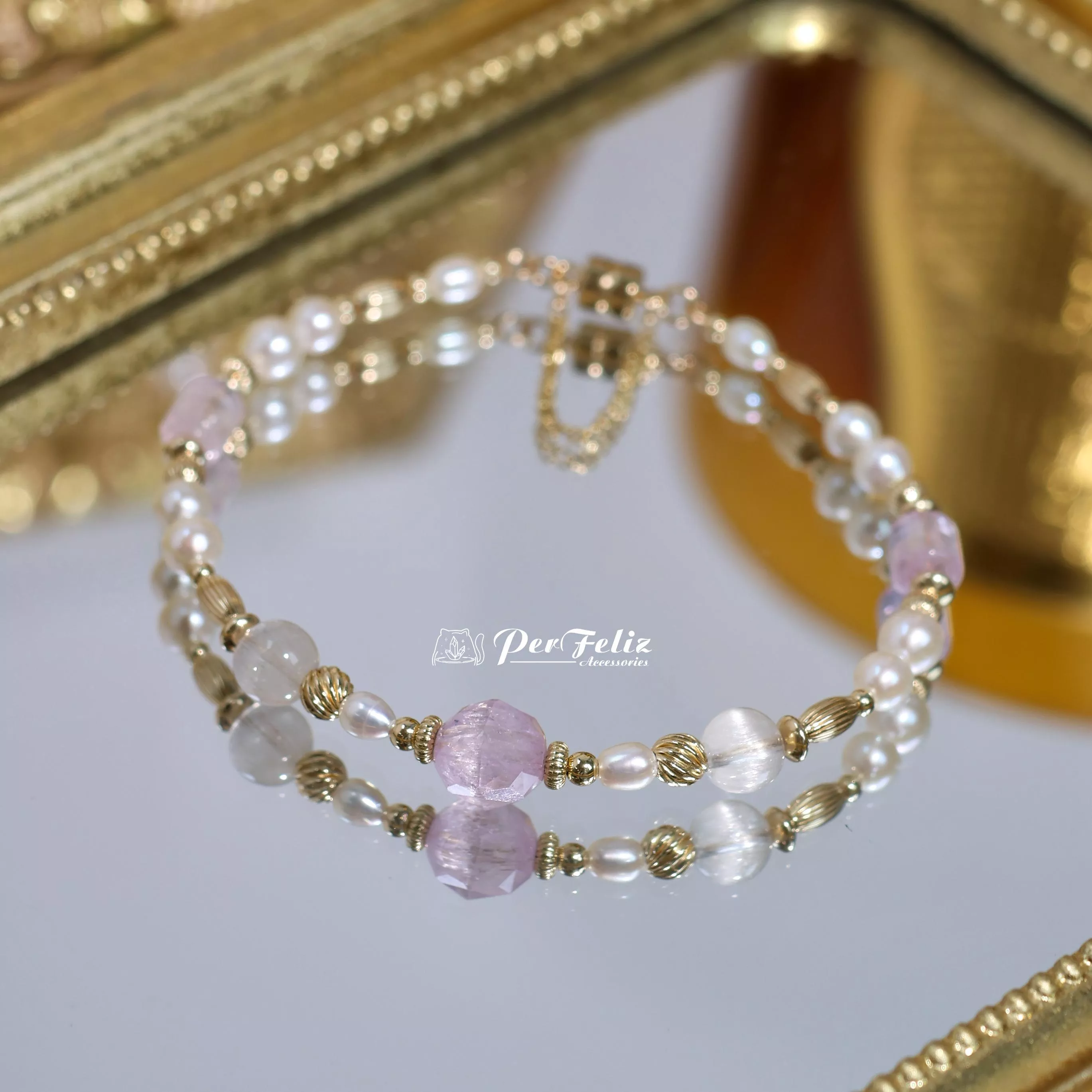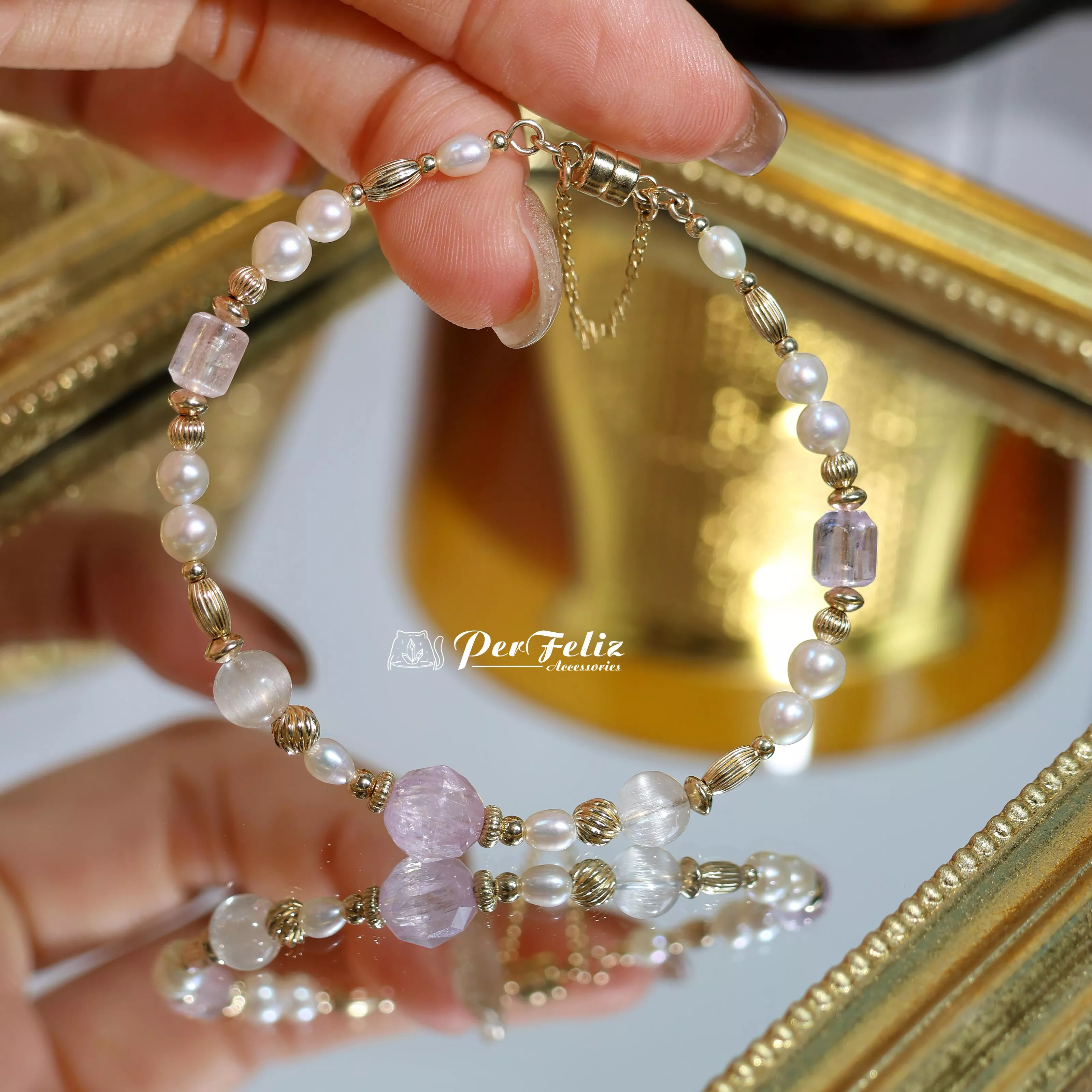 材料:紫鋰輝鑽切/桶珠、白兔毛、天然珍珠