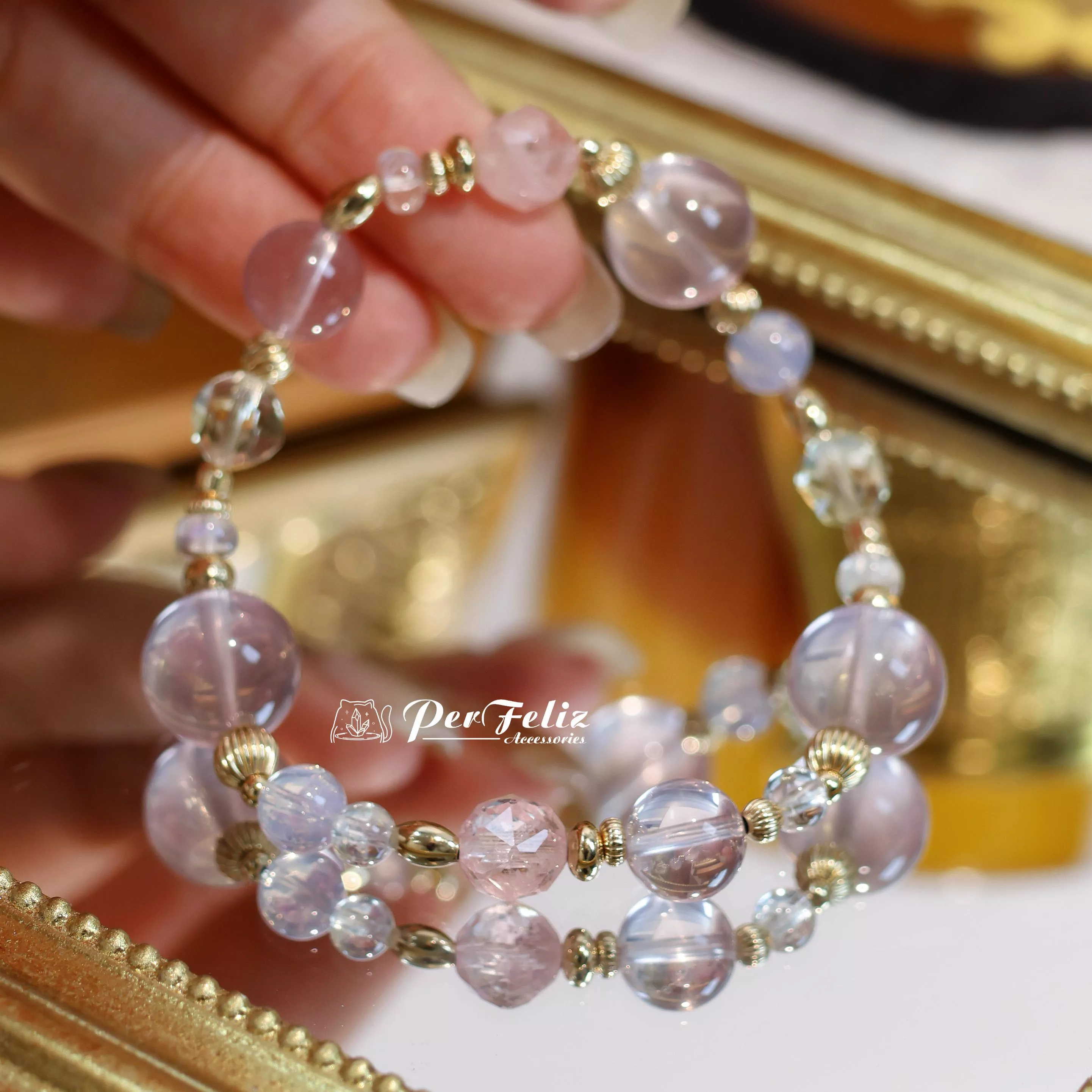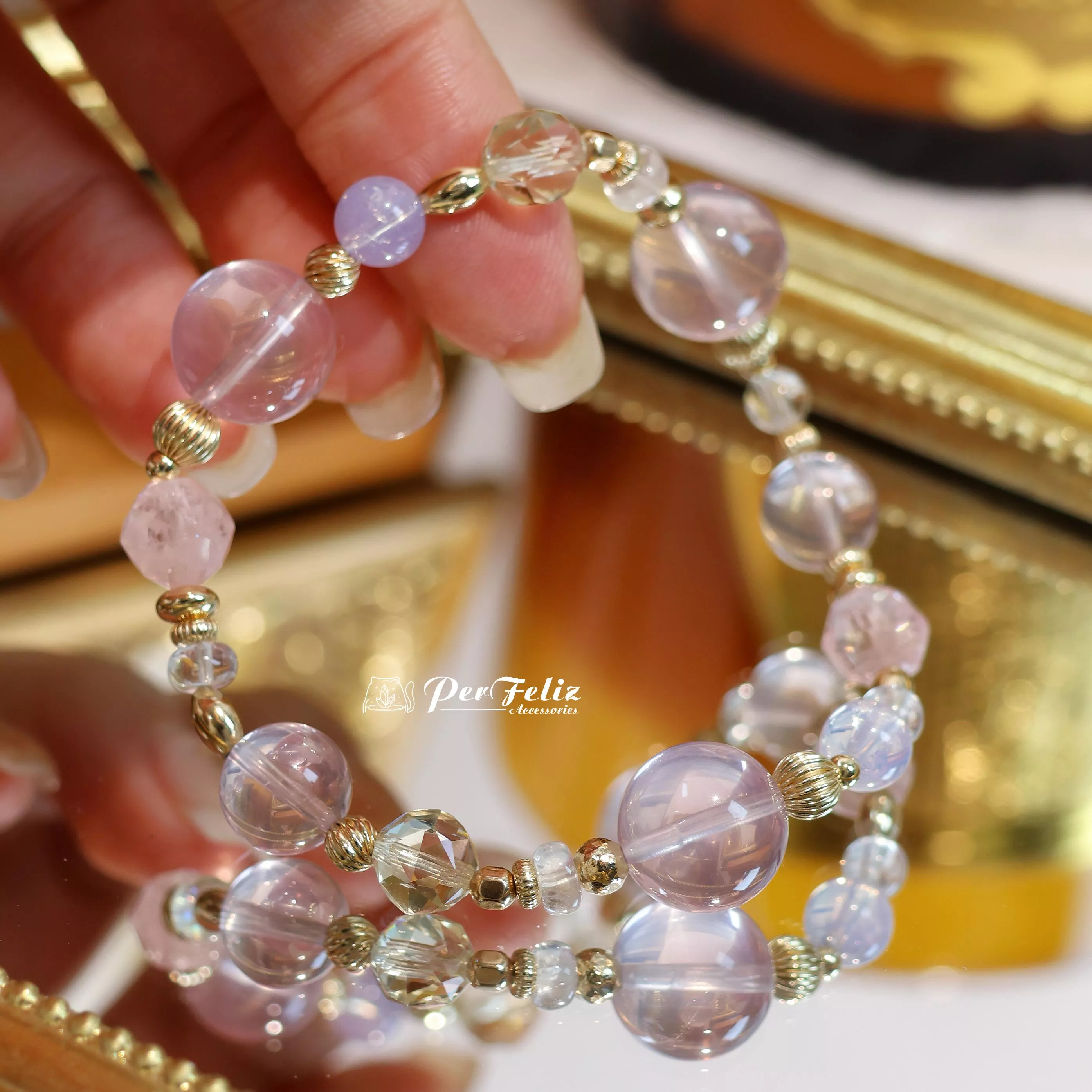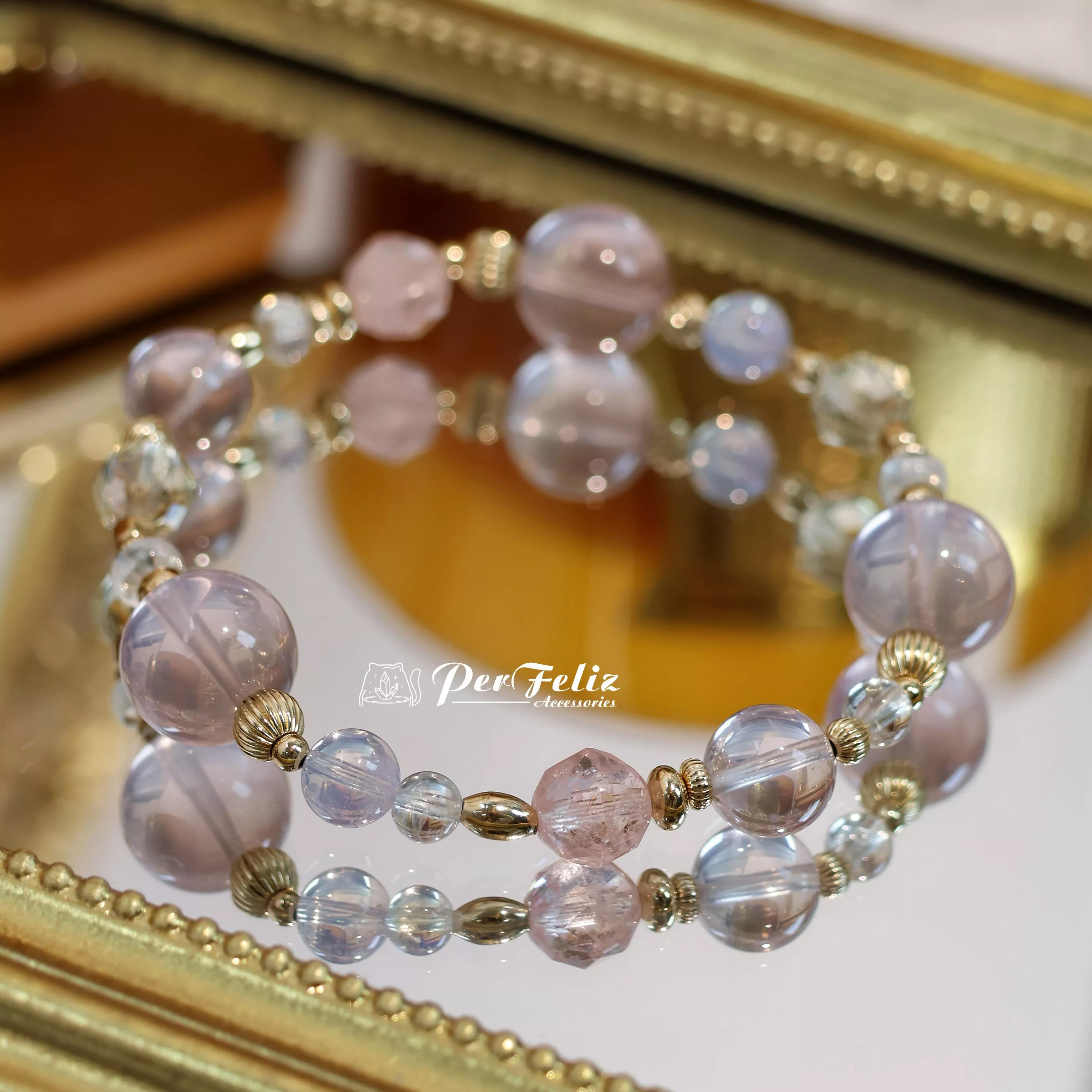 材料:紫羅蘭色粉晶、金色拉長鑽切、摩根石鑽切、紫玉晶、藍月光圓珠/盤珠